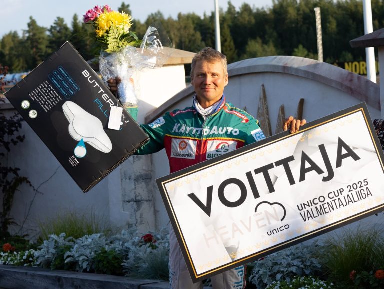 Unico Cup 2023, voittaja Olli Antila. Olli Antilaa ja Pirjo Tikkalaa oli onnittelemassa kauden päätösraveissa Unico Finland Oystä Mikko Lehto.